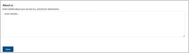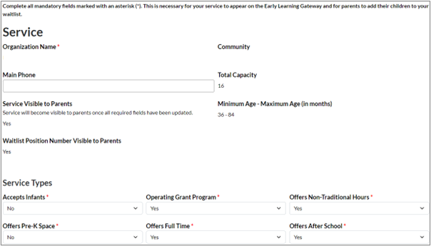 Please update the required sections by choosing from the dropdown menu for each field. Further information, such as waitlist priority or hours of operations for your service, can be added in the About us field.