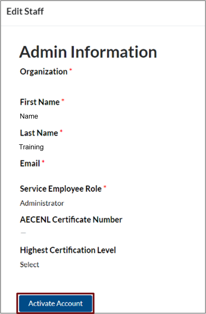 To activate an existing admin account, select the down arrow next to the admin. Click Edit Staff Member.