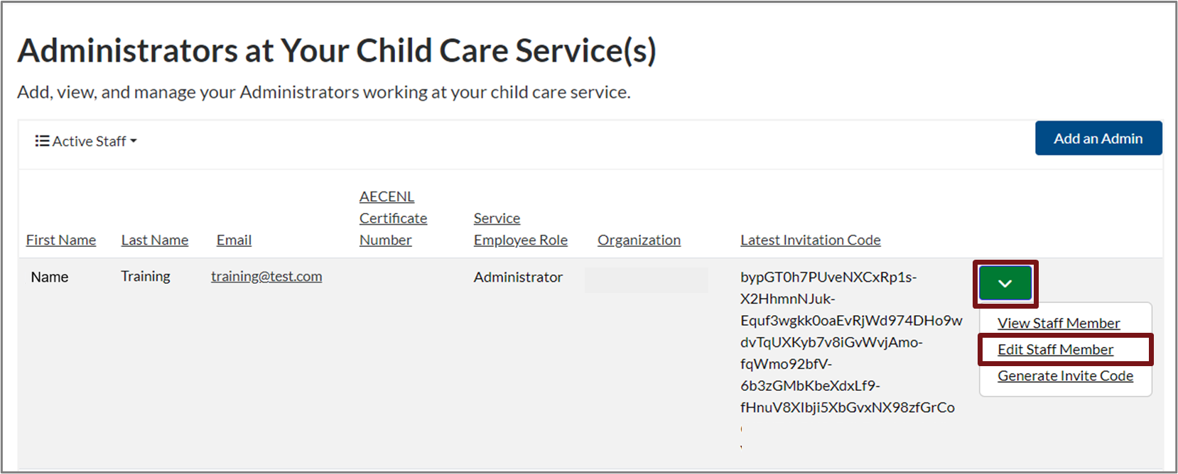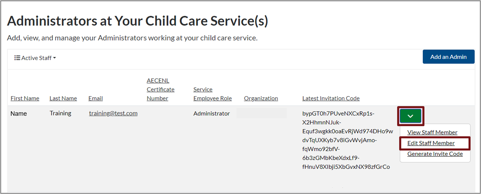 To deactivate an existing admin account, select the down arrow next to the admin. Click Edit Staff Member.