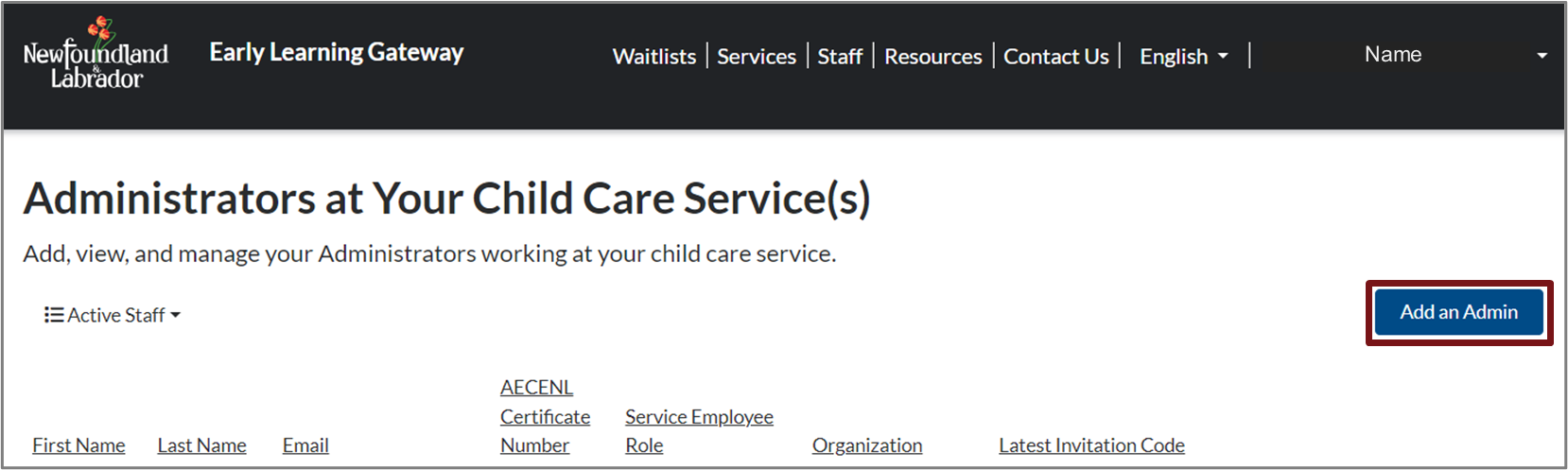 If you have an administrator responsible for managing your child care service waitlist, you can add an admin account and send them an invitation to create a username and password for the Early Learning Gateway Service Portal. To add an administrator to your staff, select Add an Admin.