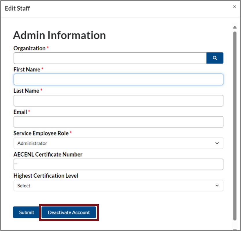 1. Complete the fields on the Admin Information screen and select Submit. Please note: Fields marked with an asterisk (*) are mandatory.