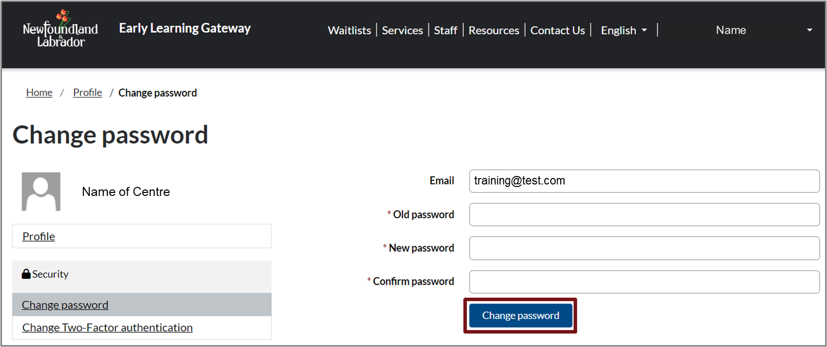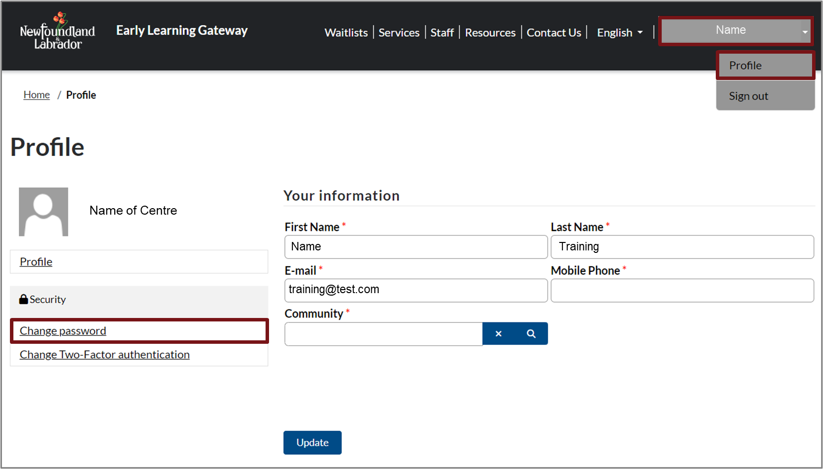 To change your password, sign into the Early Learning Gateway Service Portal, click on your name in the top right corner, then select Profile. If using a mobile device, click the menu icon at the top right of the screen. Select your name, then click Profile. Select Change password.
