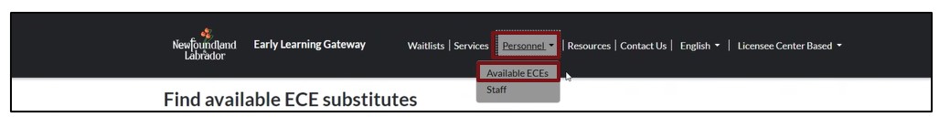 Click the Personnel button at the top of the Early Learning Gateway Service Portal, then select Available ECEs. The list of ECEs registered as substitutes in the Early Learning Gateway will appear here.