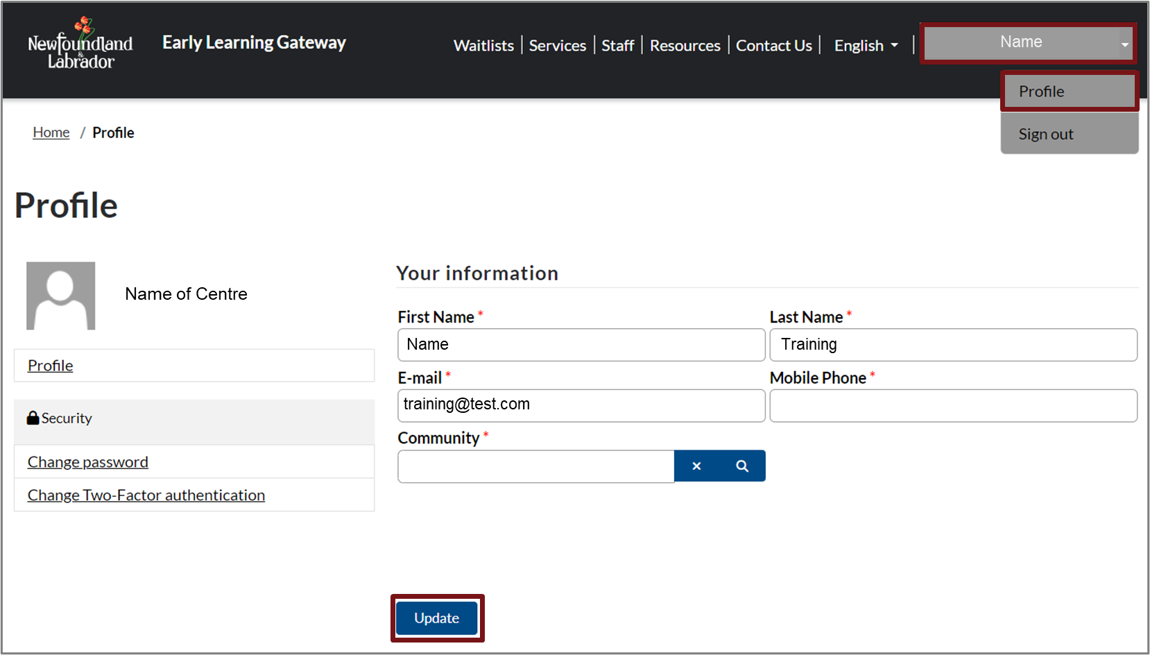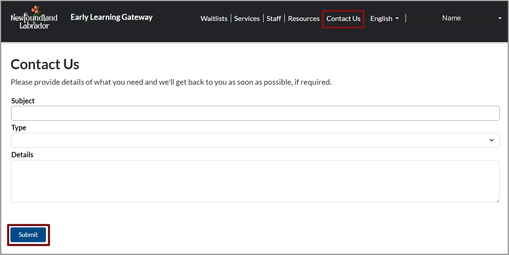 If you have a general inquiry or require technical support for the Early Learning Gateway, you can contact the Department of Education at elgateway@gov.nl.ca or use the Contact Us feature.