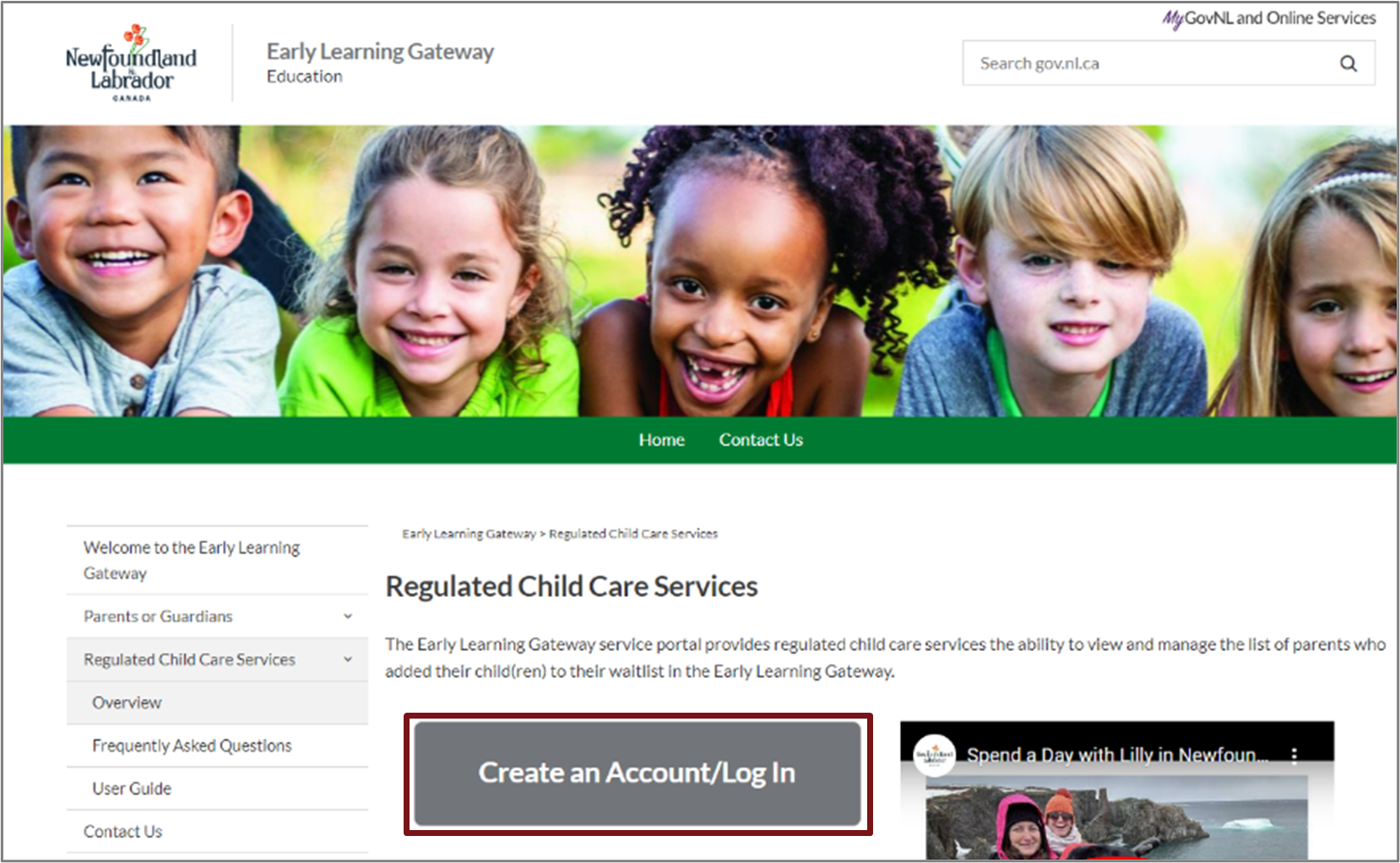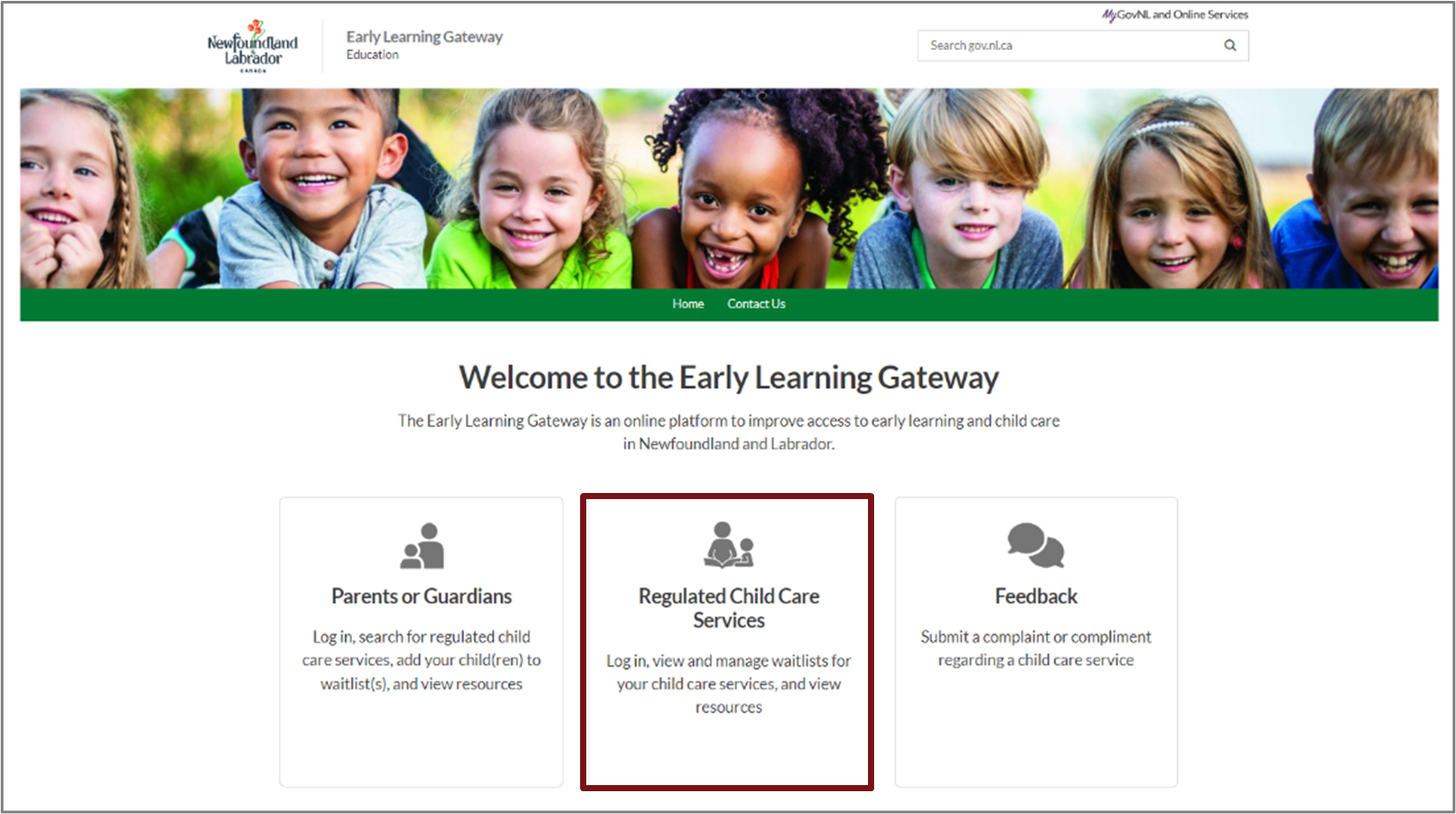 To access the Early Learning Gateway service portal, visit the Early Learning Gateway and click Regulated Child Care Services.
