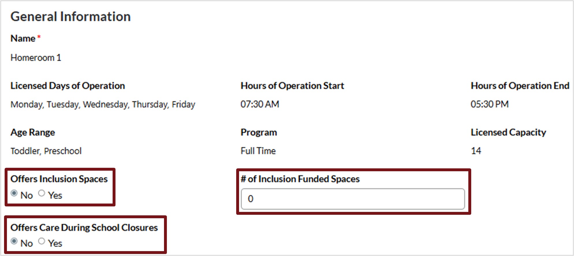 a. Click in the field provided, select Yes or No to indicate if your regulated child care service has Inclusion Funded space(s).
