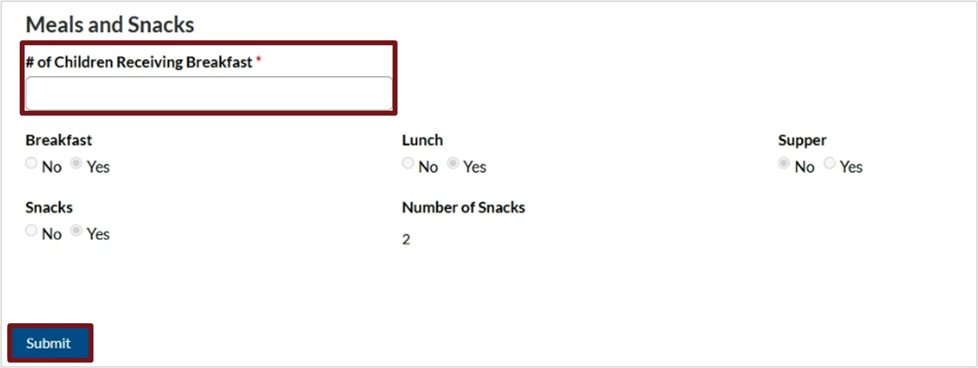 e. If you select Yes to Meals and Snacks, enter the number of Children Receiving Breakfast.
