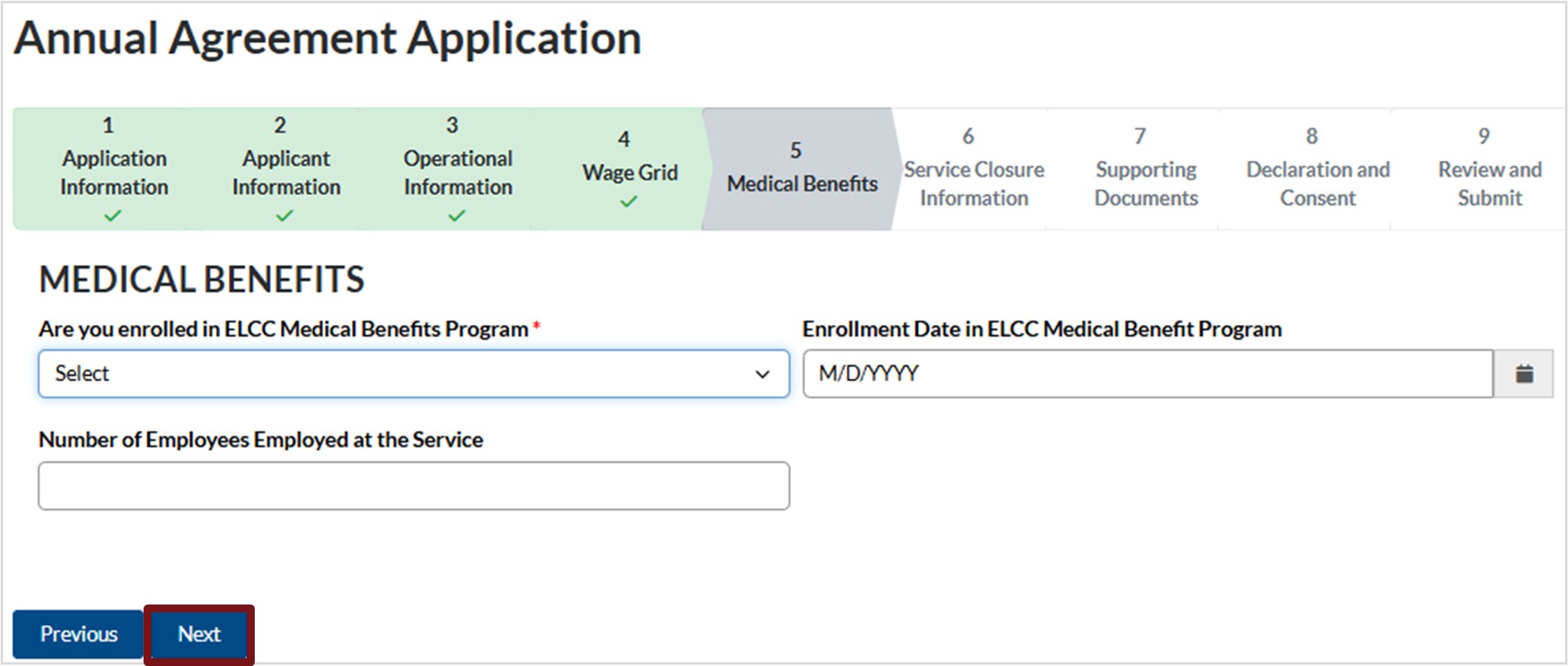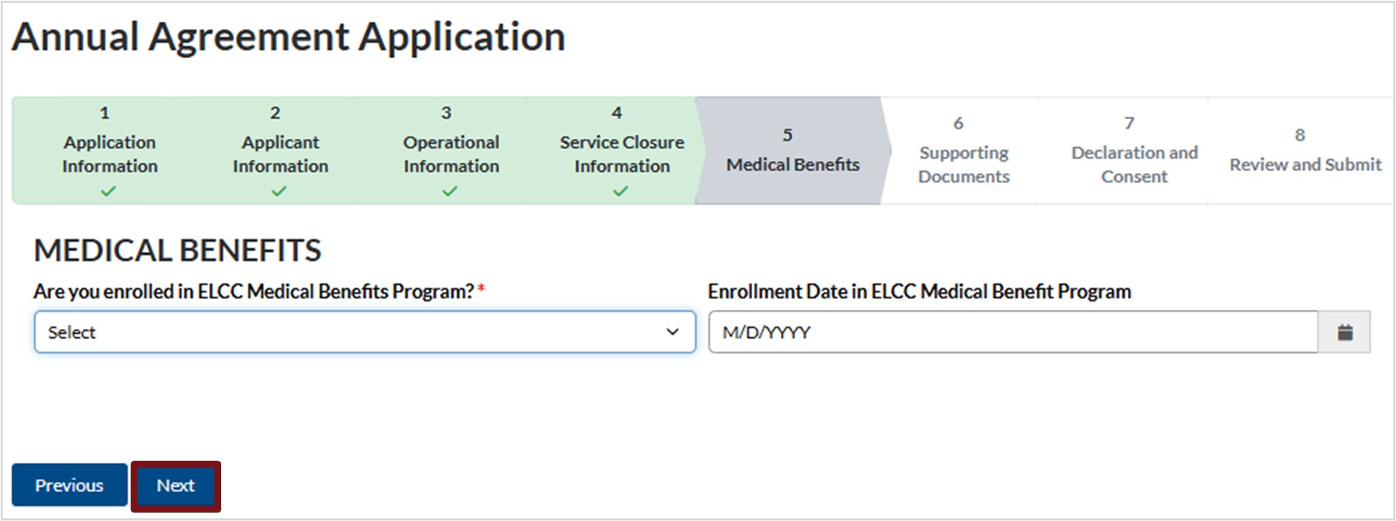1. Click the down arrow and select Yes or No to indicate if you are enrolled in the ELCC Medical Benefits Program.
