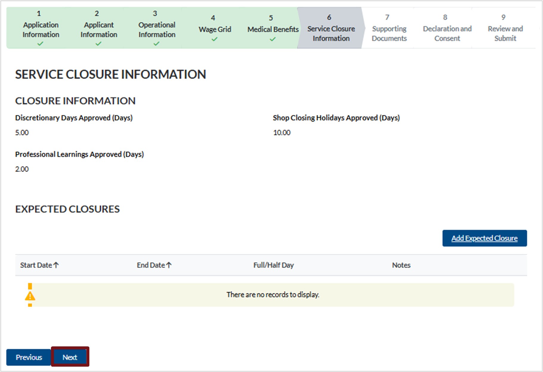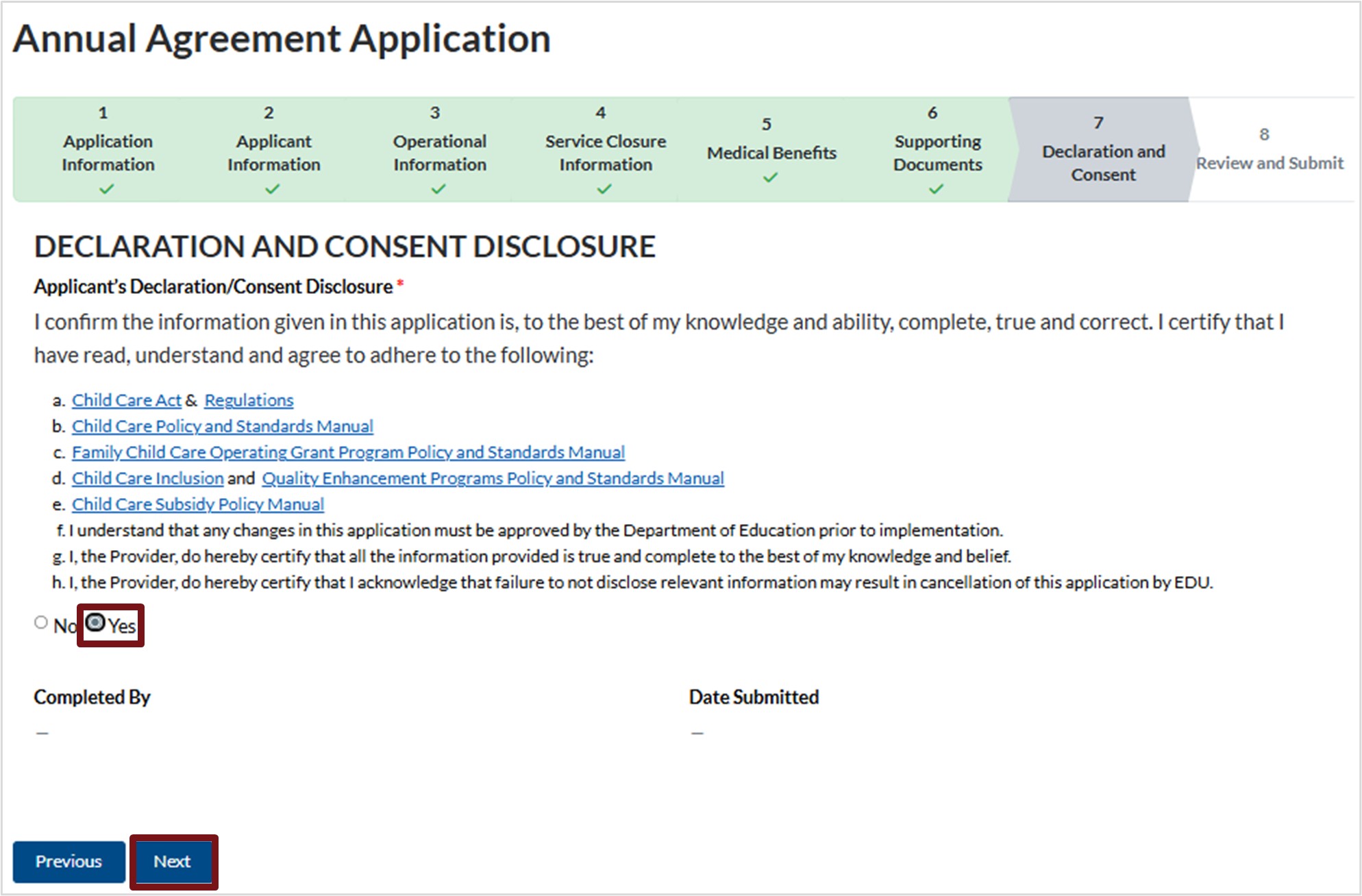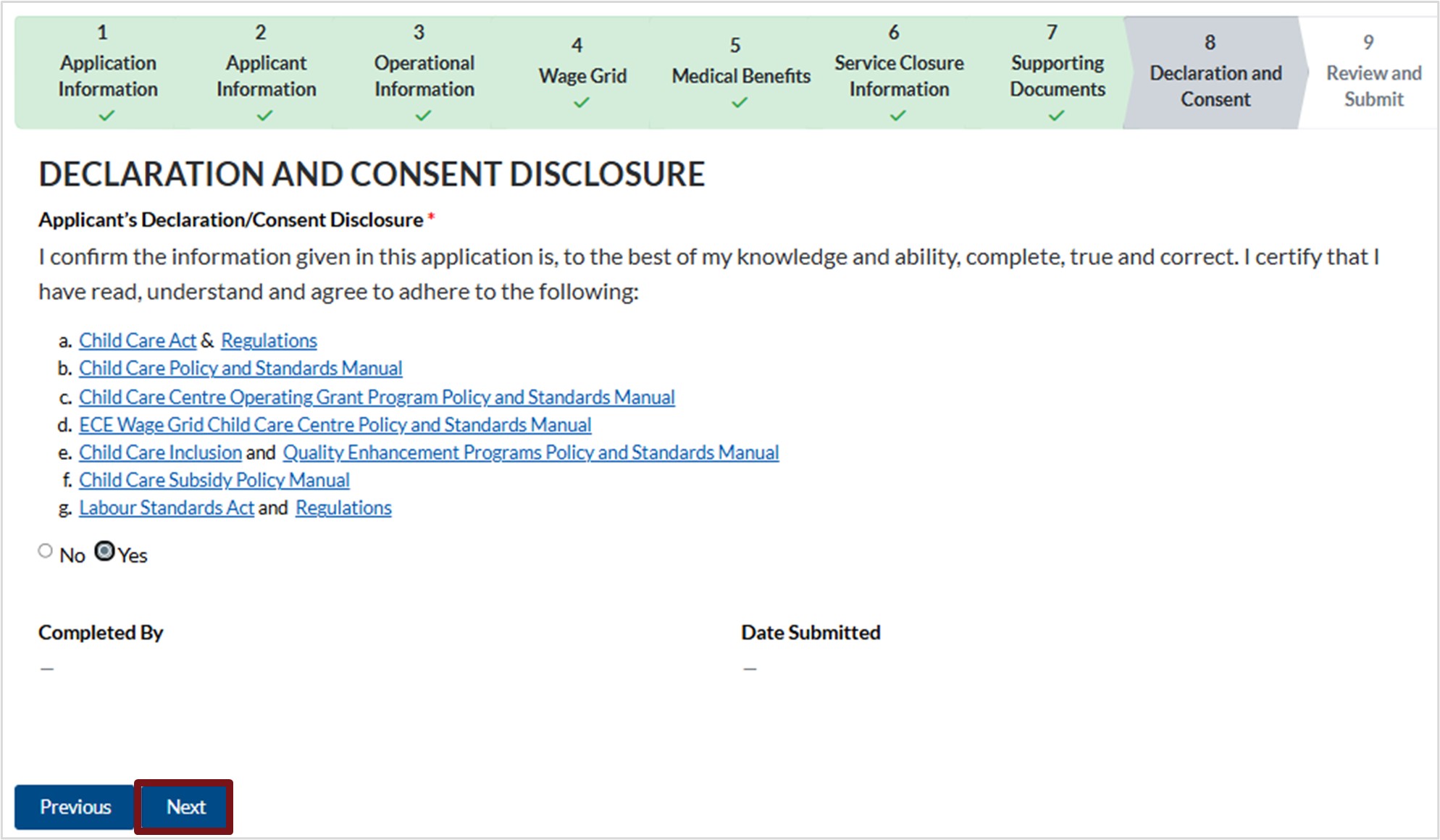 - Select No if the question is not applicable to your child care service.