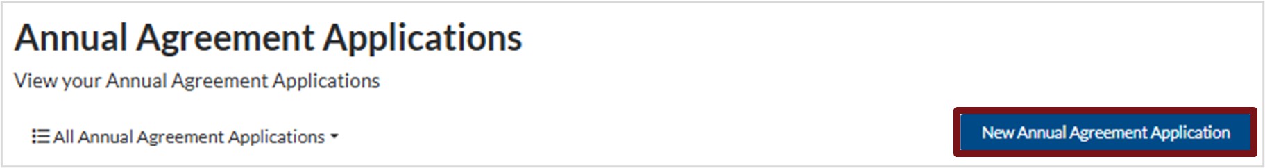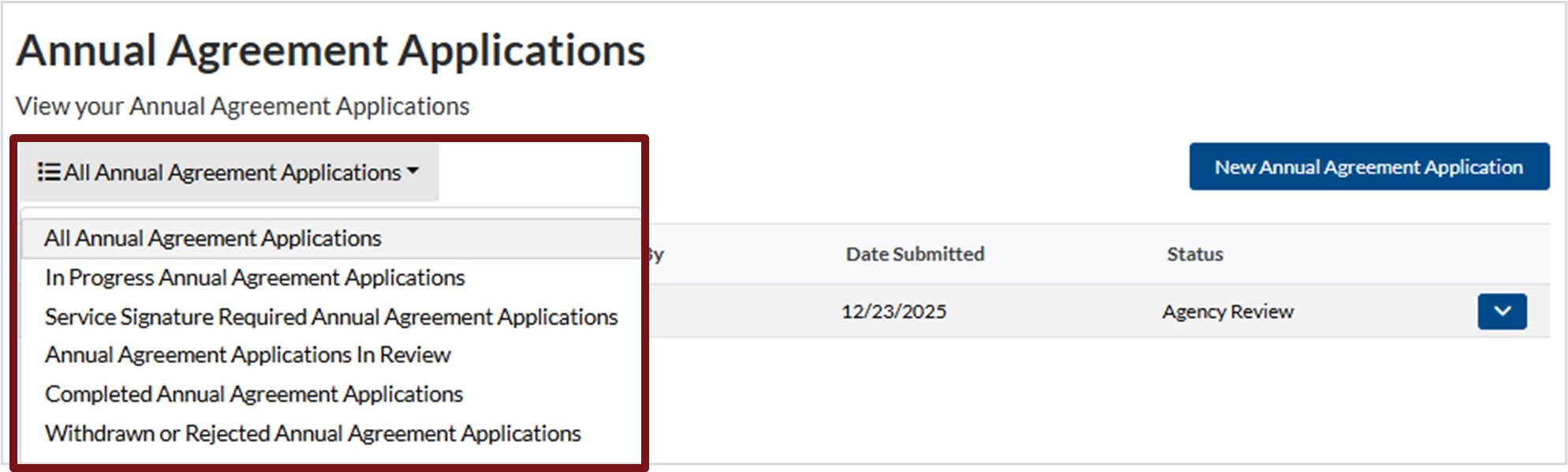 8. To filter or review an annual agreement, click the down arrow next to All Annual Agreement Applications and select the view you want.