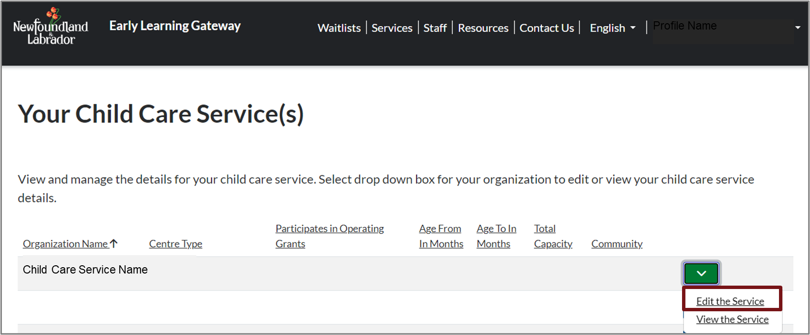 Licensees and administrators can view and manage details for the service by clicking Services at the top of the Service Portal window. You will see any child care services that you manage under the Your Child Care Service(s) section.
