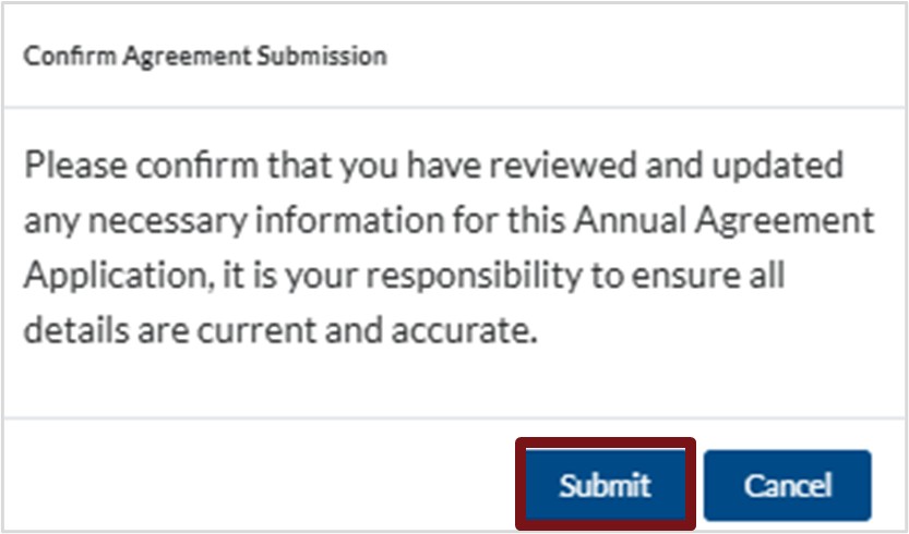 c. You will receive a prompt to confirm that you have reviewed and updated any necessary information for the Annual Agreement Application. Click Submit.