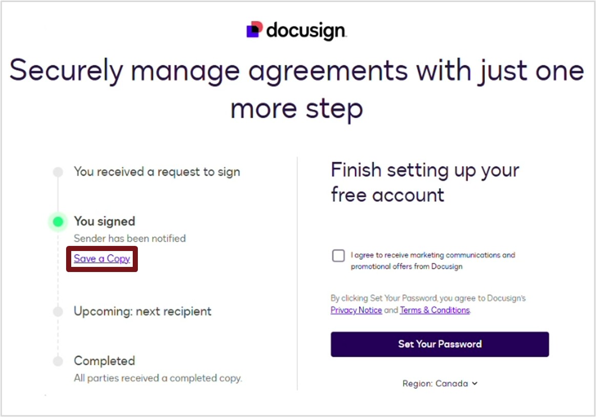 5. Open the downloaded Signed Agreement – Service Copy.pdf and print a copy to keep for your records.