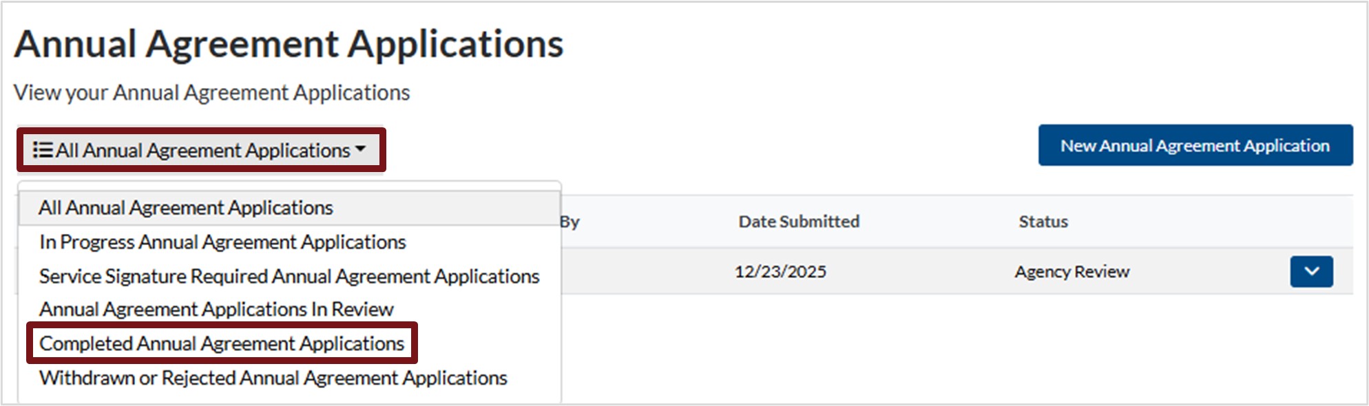 2. Click the down arrow next to All Annual Agreement Applications and select Completed Annual Agreement Applications.