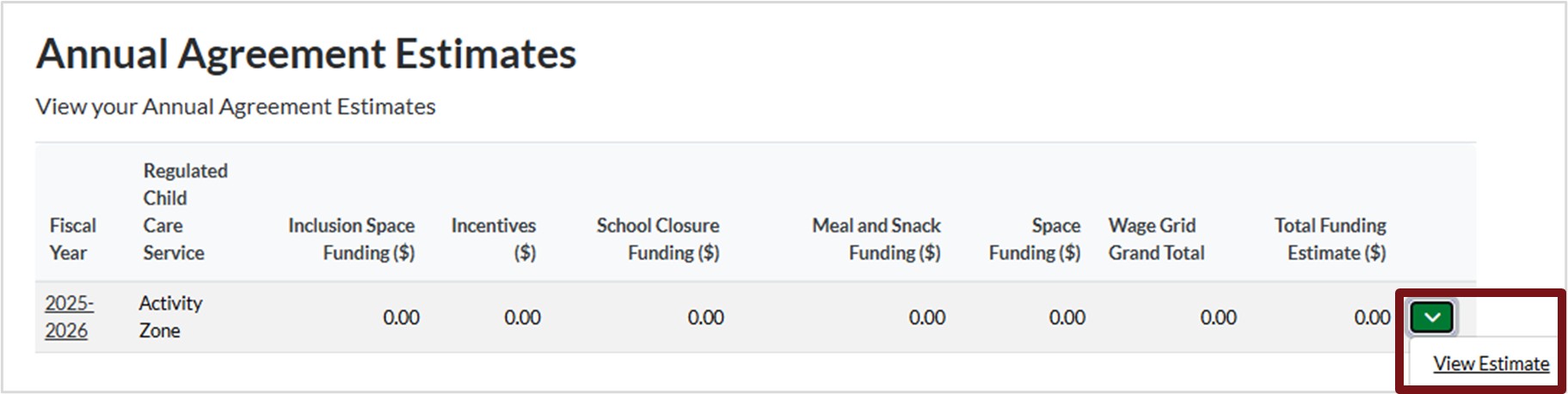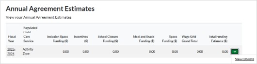 3. The Annual Agreement Estimates window will open, scroll down the screen to review the estimates.