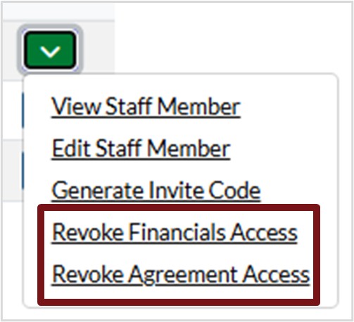 2. Click the down arrow next to the staff you want to provide access to, then select Grant Financial Access and Grant Agreement Access.