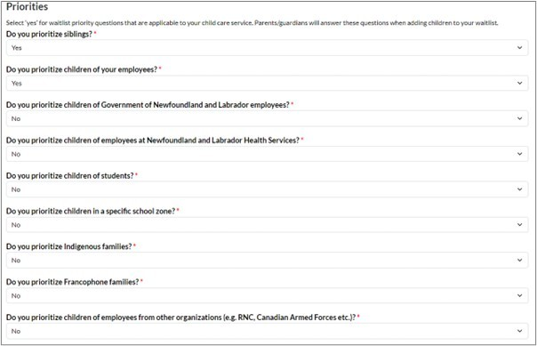 Child care services can choose from a selection of priority questions for parents/guardians to answer when adding their children to the waitlist, if applicable to the service. These questions are optional but can assist in managing the waitlist more effectively.