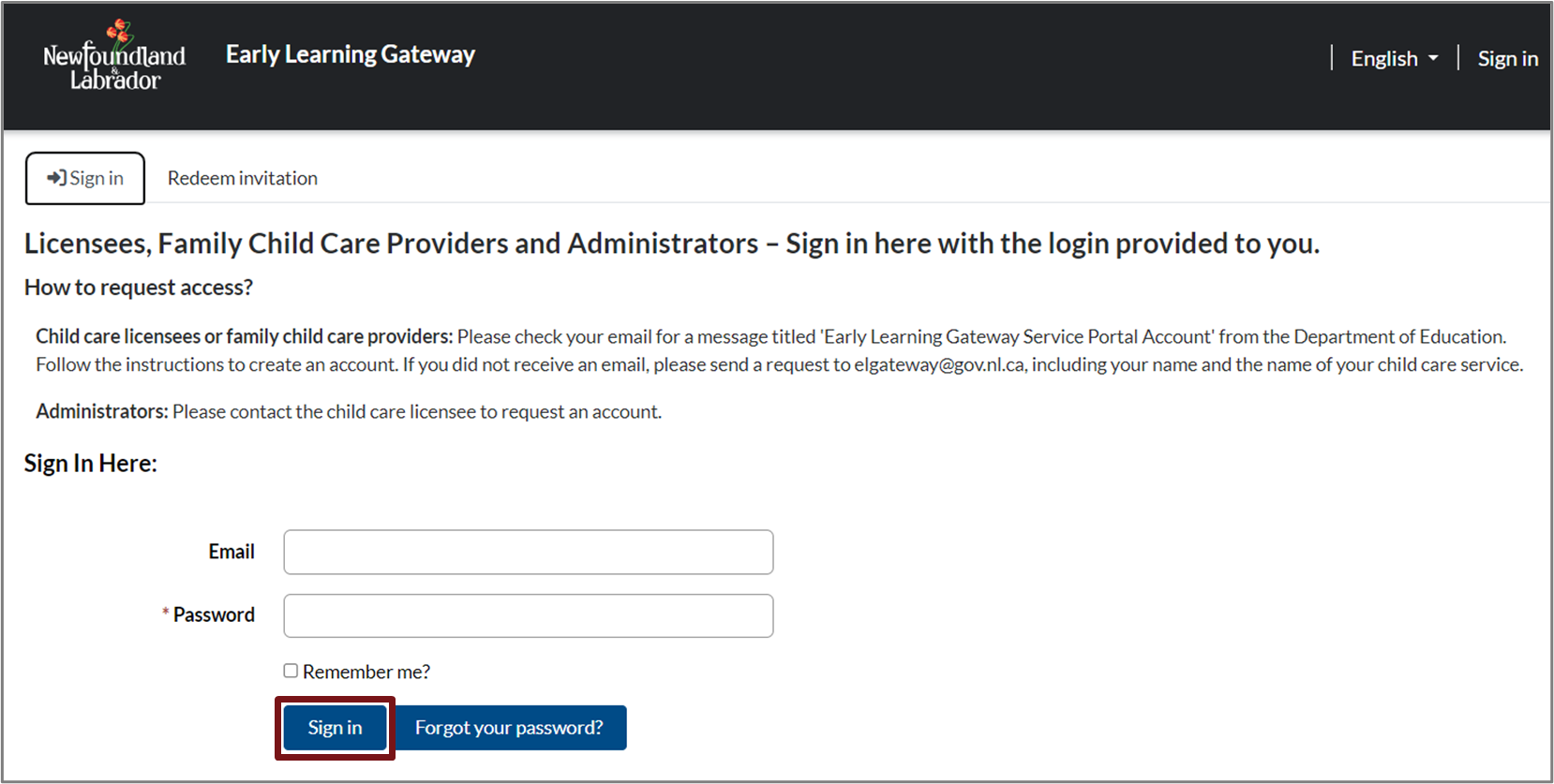 Please check your email for a message titled ‘Early Learning Gateway Service Portal Account’ from the Department of Education. Follow the instructions below to create an account. If you did not receive an email, please send a request to elgateway@gov.nl.ca, including your name and the name of your child care service.