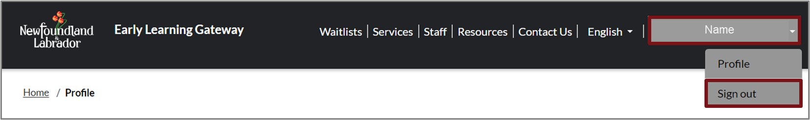 To sign out of the Early Learning Gateway Service Portal, click your name, then click Sign out.