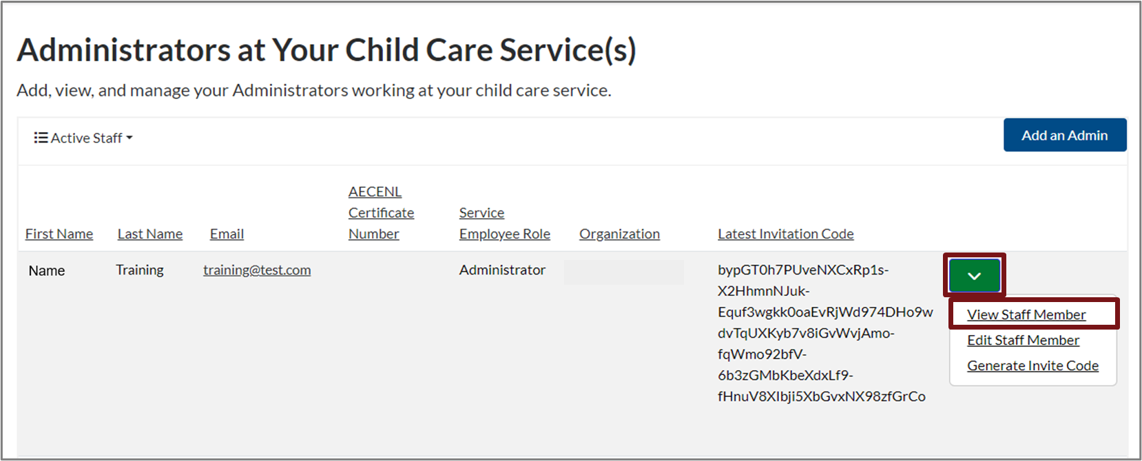 To view an existing admin, select the down arrow next to the admin. Click View Staff Member.