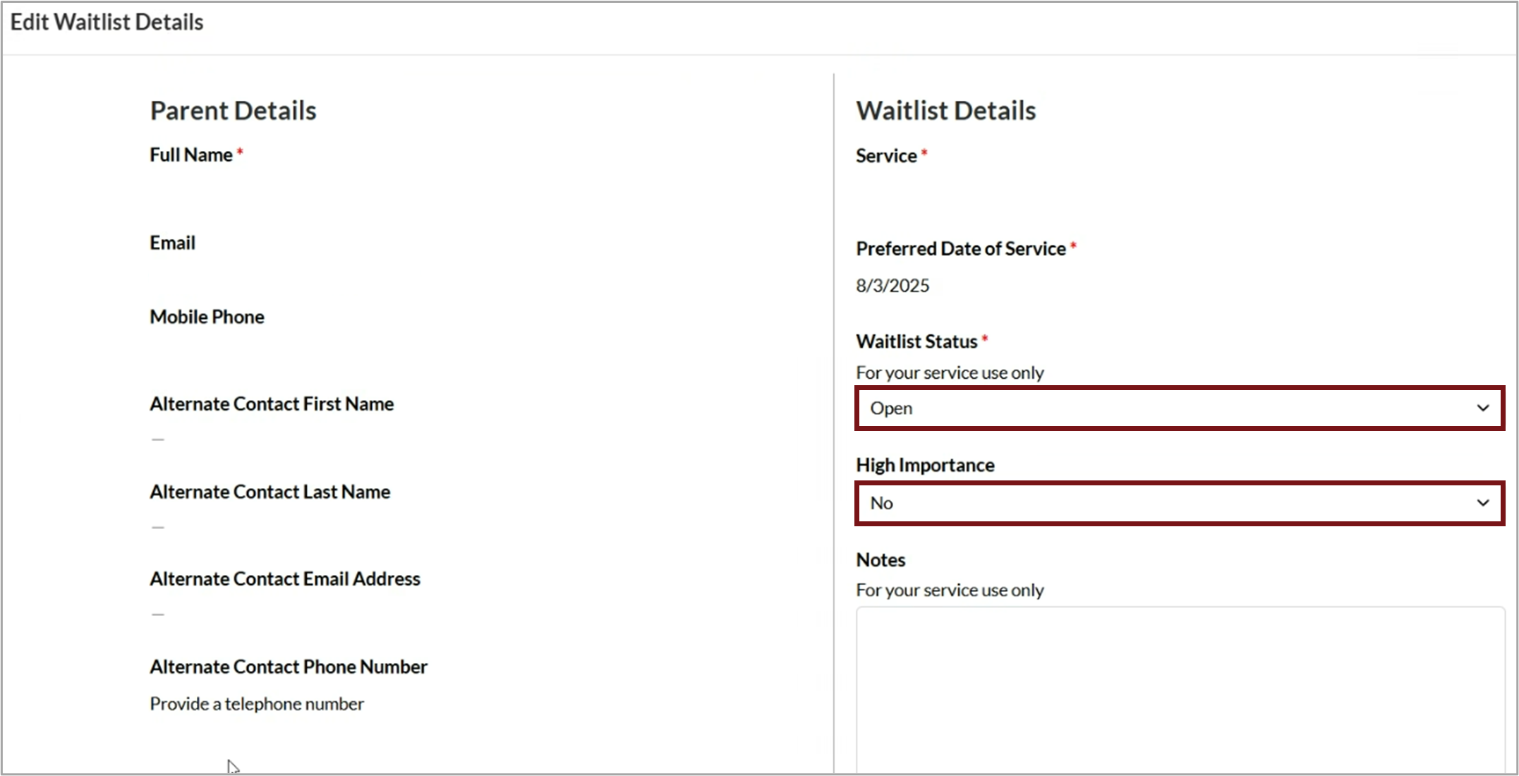 • Waitlist status and notes are for your service use only. If you email a parent/guardian, please exclude personal or health information.