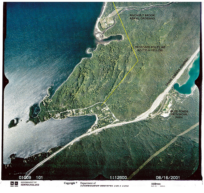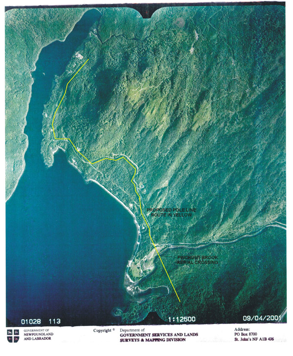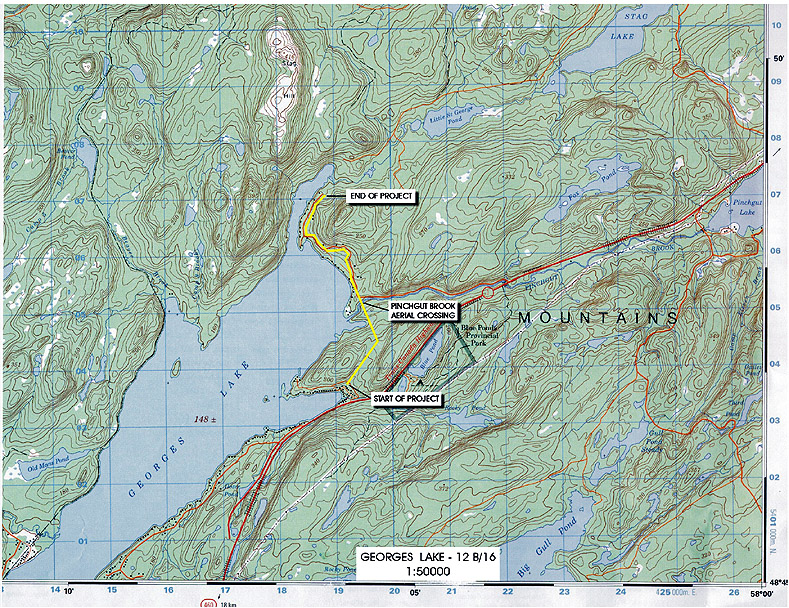 The proponent proposes to construct a 4.2 kilometre aerial communication (telephone) transmission line from Coleman’s Cove to cottages located on the north east side of Georges Lake, in Western Newfoundland. The proposed route will include an aerial crossing of Pinchgut Brook, a scheduled salmon river. The rational for the project is to provide telephone service to the cabins in the area. The project is planned to consist of 10 to 15 metre high single pressure treated CCA wood poles with an average span of 70 metres between each pole and cable attached approximately 6 metres above the ground. The cleared width of right-of-way will be approximately 5.4 metres, or 2.7 metres either side of centerline. The project will include surveying, brush clearing and installation of poles and cable.