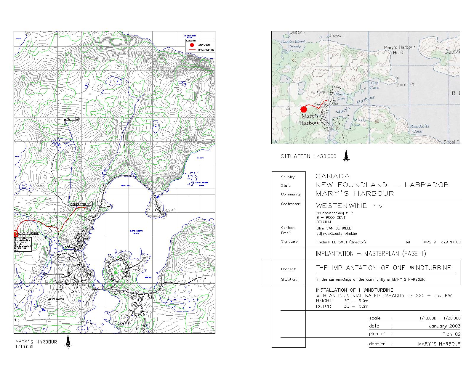 The proponent proposes to construct and operate a single wind turbine generator (WTG) in the municipal boundaries of the Town of Mary?s Harbour, Labrador. The WTG is planned to be located to the west of the Town and approximately 800 metres from the Town?s diesel generator site. The proposed WTG is a conical tubular steel tower with a maximum hub height of 60 metres and a three bladed rotor diameter of between 30 and 50 metres. The proposed power generation from the single WTG is between 225 and 660 kilowatts (kW). Power from the WTG will supplement the existing diesel generating plant and is to be sold to Newfoundland and Labrador Hydro for distribution and resale to customers. Construction for the project will also include a 4.5 metre wide access road and power and telephone transmission lines for connection to the local grid.