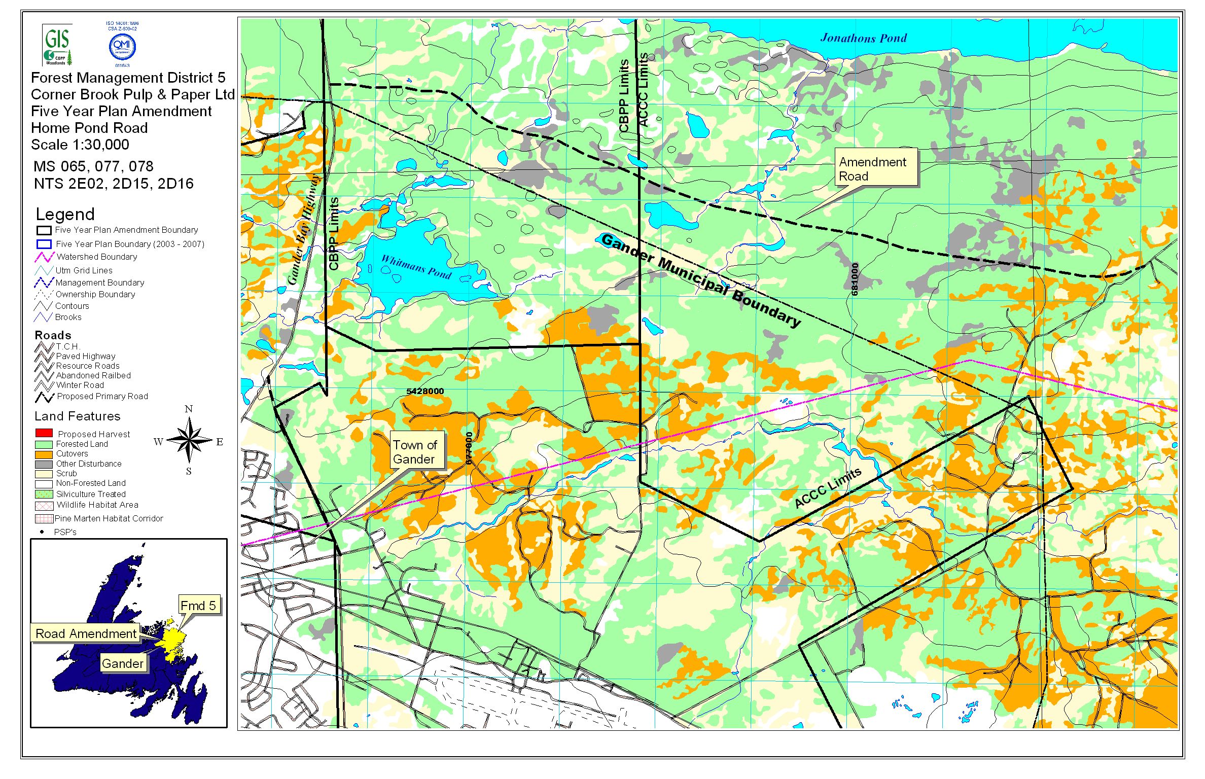 The proponent intends to construct 8.5 kilometres of primary forest access road (Home Pond Road) off the Gander Bay Highway north of Gander Airport and south of Jonathons Pond commencing late in 2005 or early 2006. Mechanical harvesting of the road right-of-way will take place and at least four streams will be crossed. Only currently approved timber inventory will be accessed.
