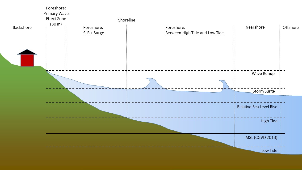Sea level rise, storm surge and storm waves are expected to have a significant impact on coastal provinces like Newfoundland and Labrador. Sea level in parts of the province is expected to increase by 100 cm by 2100, projected future storm surge for parts of the province is expected to exceed 4 m, and the projected future storm wave climate for some parts of the province is expected to exceed 10 m. Coastal flooding processes of interest for hazard mapping include sea level rise, tides, storm surge and wave effects as indicated in the figure below.