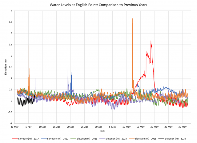 Water levels at English Point have been graphed for 2022-2025 from April 1st to May 31st. Please note that this station had an assumed elevation at the time of flooding in 2017 and was not geodetically tied-in (i.e., it was a measurement used to show the change in water level only). In 2019, it was surveyed and the elevations are now geodetic. For purposes of creating this graph a correction offset of (-)2.210 m has been applied to the 2017 data. Monitoring the water levels at this point on the river show the water level rising due to ice build-up and then water levels dropping from when the ice cleared out.