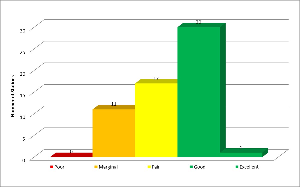 The Freshwater Quality Indicator (WQI) provides an overall measure of the ability of freshwater bodies to support aquatic life at selected monitoring stations across Canada. It is a water quality guideline-driven tool used to distill large amounts of water quality data at a monitoring station into a single index. Water quality at a monitoring station is considered excellent when ambient water quality does not exceed guidelines at any time for any of all selected parameters. When water quality is rated poor, water quality measurements usually exceed their guideline; exceedences at these stations may be large.