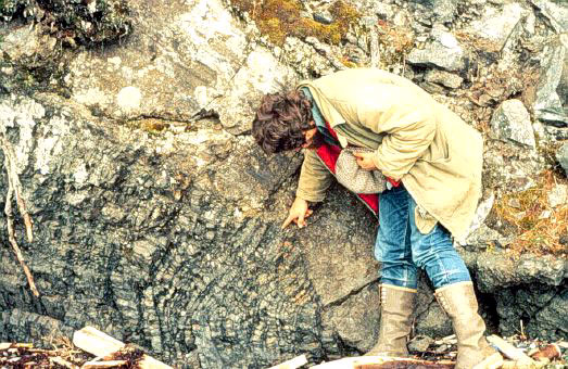 A discontinuity in the succession of rocks representing a gap in time and deposition; a buried erosion surface. Gently-dipping, grey sandstone (younger rocks) overlies steeply dipping, bedded, black siltstone and shale (older rocks) along an angular unconformable contact in the Bonavista Bay area.