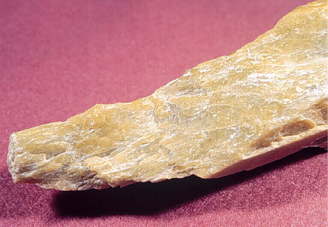 The physical properties of pyrophyllite and talc are practically identical. The main difference is that pyrophyllite has an abundance of aluminum in its chemical make-up and talc has an abundance of magnesium. The photo of the sculpture, carved from pyrophyllite, is the work of Nath Noel, The Stone Garden Gallery, St. John’s, NL. It is the property of Frank Blackwood. The photo on the right is a sample of the raw mineral.