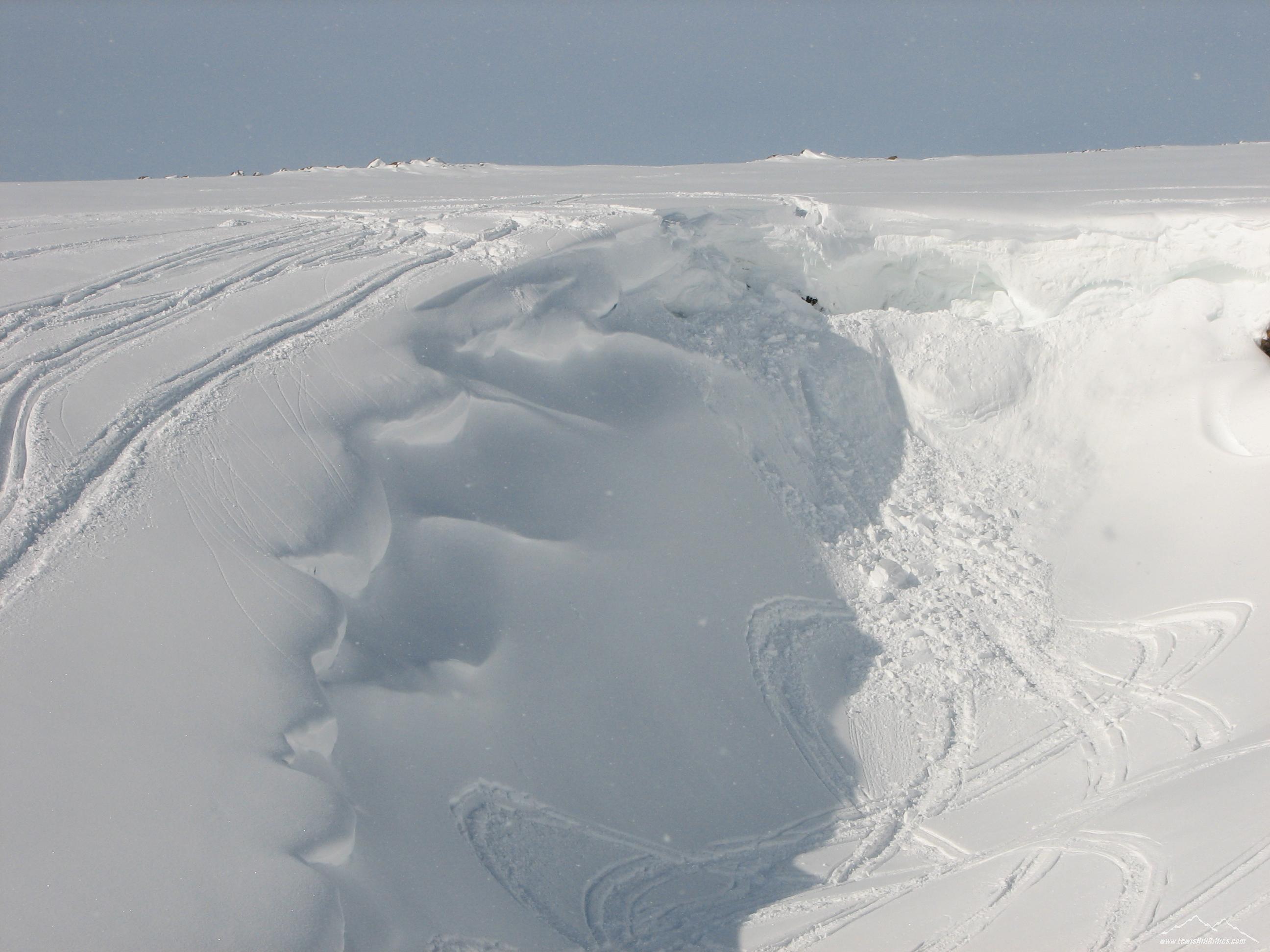 Mike MaCarthy wrote “On Fri. March 10 in the Lewis Hills area, my companions had a frightening experience. we were standing about 15 to 20 ft. away from the edge of a bowl when two of my buddies step forward and just drop out of sight. The whole rim let go and dropped about 10ft. just lucky that the piece they were on didn’t tumble or it would have been serious. A lot of chunks rolled down the steep valley. ”