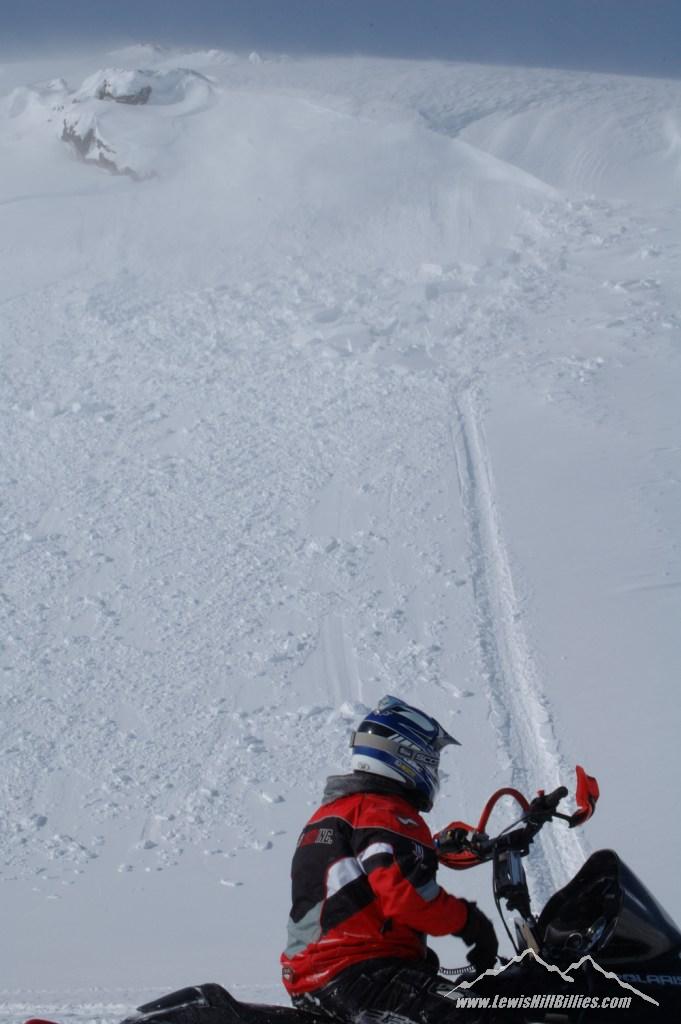 Grant also wrote “I have attached a couple of pictures of one of the avalanches that were set off while riding on February 23rd of this year. These two were small by comparison to others that have been seen in the Lewis Hills. One of our riders cut across the hillside while a second rider followed further back. The second rider was caught in the slide and his snowmobile was taken completely away from him and deposited at the bottom of the slope.”
