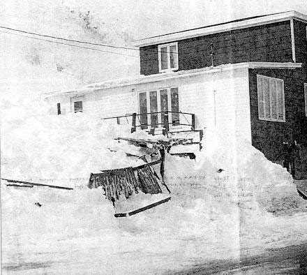 An avalanche took place between 7 and 7.30 am on March 14, 1997 on High Street (off Caribou Road) following a night of heavy snowfall, and high winds. The preceding month had unusually heavy snowfall. The snow was apparently fine and drifting. The avalanche mostly affected a parking lot, filling it to a depth of 8-10 feet, over an area of 150′ by 40′. At one end of the parking lot a two story house (used as a home for handicapped children) lost the deck and wheelchair ramp, which was swept into the road. A youth was shoveling snow on the deck when the avalanche occurred but was able to escape burial. A car parked adjacent to the house was swept across the road and experienced minor damage. The Town Manager recalled that a similar incident occurred about 25 years ago in this area, with some property damage to a garage, but was unable to give a specific date. He was of the opinion that the house that experienced the damage was extremely fortunate to avoid the full force of the avalanche.