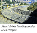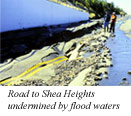 But access to Shea Heights remained a question mark, said the city’s director of public works, Paul Mackey. Crews were expected to open one lane of Blackhead Road for emergencies. The bottom of the road looked like an earthquake hit. Pressure from water seeping under the asphalt reduced it to rubble, with water gushing through the crevices. Residents were getting back and forth by foot or on all-terrain vehicles. A fire truck was stationed on Shea Heights for emergencies. “It’s wicked,” said Shea Heights resident Terry Reid. “It’s flooded out up there before but nothing like this.” Up on Shea Heights, there were several flooded areas, including Jordan Place, where a former oil tank dyke ruptured sending water cascading down on some residences.