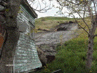 At 3:00 am a large landslide took place from steep slopes behind the community of Trout River. Heavy rainfall had saturated the slope, which contained glaciomarine clay and silt. About 100 cubic metres of material failed as a combination rotational failure/ debris flow. At the base of the hill, the debris flow displaced and damaged two sheds; one stopping less than a metre from a home. The larger shed served as a barrier blocking the material from going into the home, whereas the smaller shed rested against a large tree that also blocked the material from ending up into a second home. Residents in the area, indicate there is a history of similar landslides, where sheds have been damaged and displaced. Further tension cracks were apparent upon inspection and thus five homes below this vulnerable area were evacuated on a temporary basis.