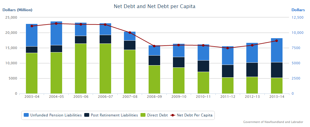 Put very simply, net debt is the money you owe minus they money you have – liabilities minus financial assets. For example, if you have $1000 on your credit card, and $500 in your savings account, your net debt is $500.Net Debt declined from a high of $11.9 billion in 2004-05 to $7.8 billion in 2011-12, a decline of 34 per cent. However, since then net debt has increased to $9.1 billion in 2013-14 and is projected to increase to $10.4 billion as of March 31, 2015.