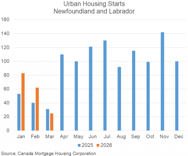 According to data released by the Canada Mortgage and Housing Corporation (CMHC), urban housing starts in Newfoundland and Labrador totalled 25 units in March 2026, a decrease of 19.4% (or six units) compared with March 2025.
