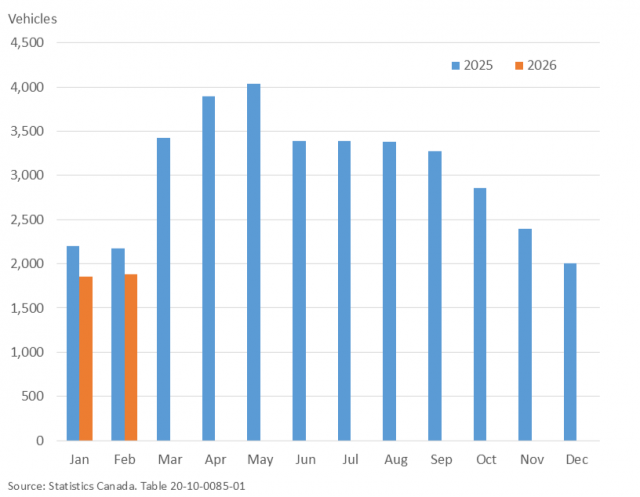 On a year-to-date basis, the number of new motor vehicles sold in Newfoundland and Labrador decreased by 14.5% compared to January-February 2025, and the value of sales decreased by 12.4%.