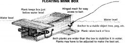 “Contained” body gripper traps are very effective and, in certain circumstances, can be used to avoid non-target animals. For example, body grippers set inside baited floating wooden boxes (mink box) work very well for capturing mink over water and reduce the risk of trapping species such as the Newfoundland Marten. Body gripper traps set inside a floating mink box also make it very difficult for domestic animals to get into. Where there are no concerns for Newfoundland Marten, mink boxes set on land that have a cover with a 2 ½ inch hole also become quite effective for reducing captures of other non-target animals.