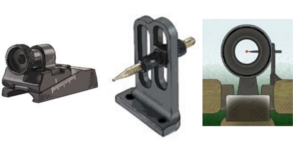 Sight systems for crossbows include the peep/pin, red dot, and telescopic or scope. The peep/pin is a basic sight that consists of a rear peep with a blade or pin front sight. Red dot and telescopic sights or scopes can be designed to work specifically with crossbows and permit a clear view of the target at close range. They usually feature multiple crosshairs or aiming points that correspond to distances of 20, 30, and 40 metres (yards).