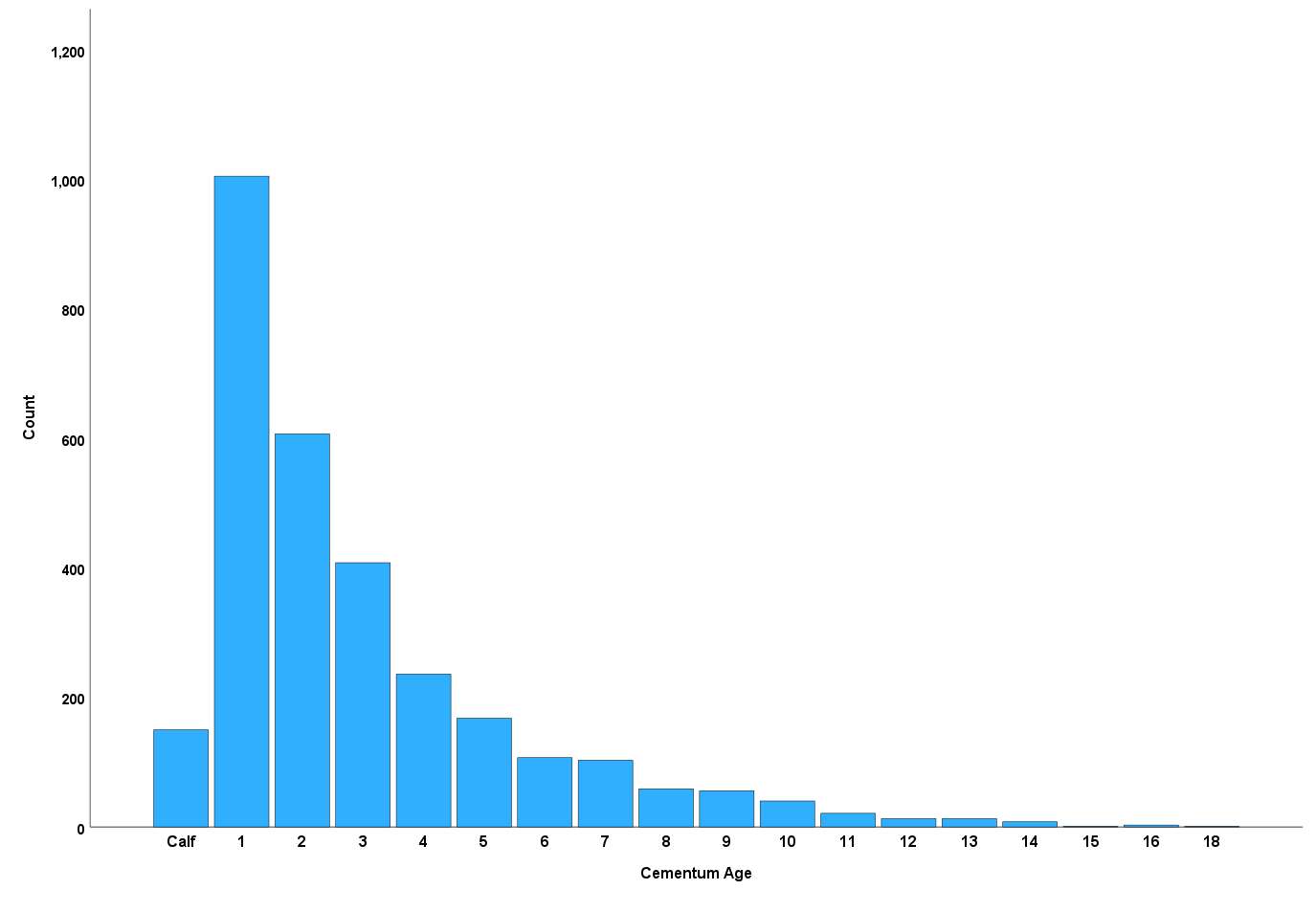 Cooperating hunters from the 2023-24 Island Moose Season enabled the collection of the information represented in this graph. The oldest moose was interpreted at 18 years old. This information is taken from extracted and analyzed moose jawbone teeth.