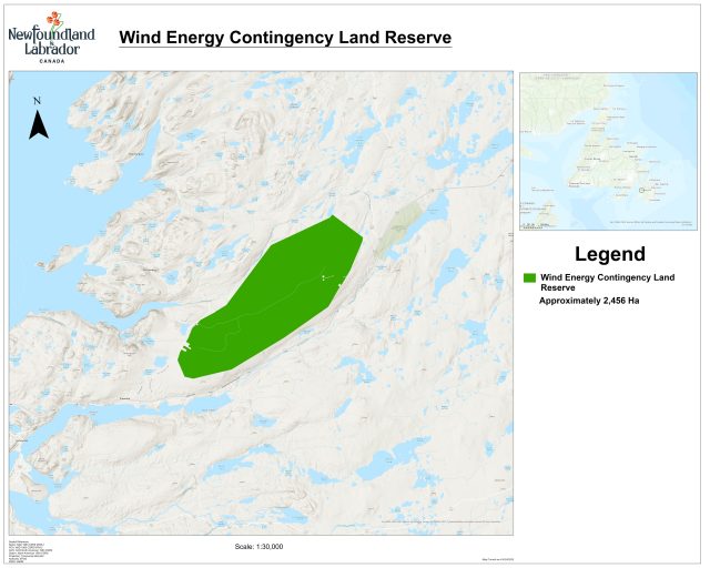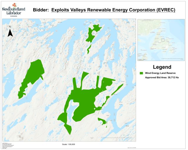 On August 30, 2023, the Department of Industry, Energy and Technology (IET) announced that four bids from four companies were selected through the Crown Land Call for Bids for Wind Energy Projects (Call for Bids) to receive wind application recommendation letters and have been granted the exclusive right to pursue the development of their project through the Government of Newfoundland and Labrador Crown land application and approval process, which includes a referral to Environmental Assessment (EA). Final project details, such as wind turbine locations, will be informed through the Crown lands and EA processes. On August 22, 2025, IET announced that this reserve has been extended to February 28, 2026 and that it has been reduced in size by 132,733 hectares to 381,676 hectares. Overview of Four Projects Selected through the Call for Bids