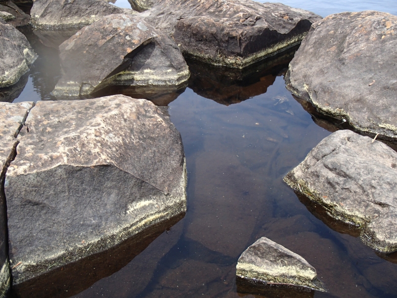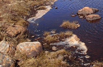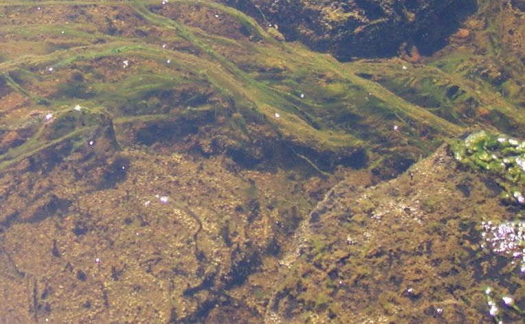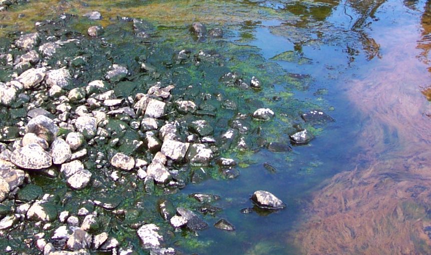 There are many types of algae found in Newfoundland and Labrador fresh waters. Algae are part of the natural ecosystem. Typically, algae are observed as a green or brown scum or filaments attached to solid objects on the bottom of a water body. When water levels drop, dried algae may look like a white powdery substance on the rocks in a stream. Sometimes it is mistaken for toilet paper!