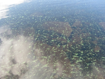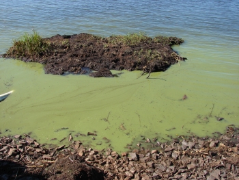 Sometimes, when algae die off, they float to the surface and accumulate on a windward shoreline. Massive accumulations of algae are usually indicative of some change in the natural balance of the ecosystem and are often associated with excessive nutrient loading from sewage or fertilizer.