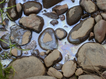 - Poke Test: Break the oily surface with your finger or a stick. If the sheen breaks apart, it is likely a natural film. If the sheen moves together again, the film is likely petroleum based.