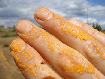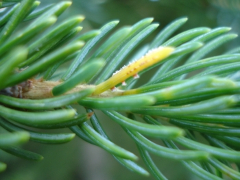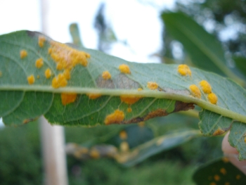 Experts were able to determine that the substance was rust fungus spores, which are part of the natural life cycle of rust fungus. Although having been observed previously in parts of the province, accumulations of this magnitude are uncommon. Water testing determined that there was no health risk, nor impairment to water quality. Photos below show the rust fungus on deciduous and coniferous trees.