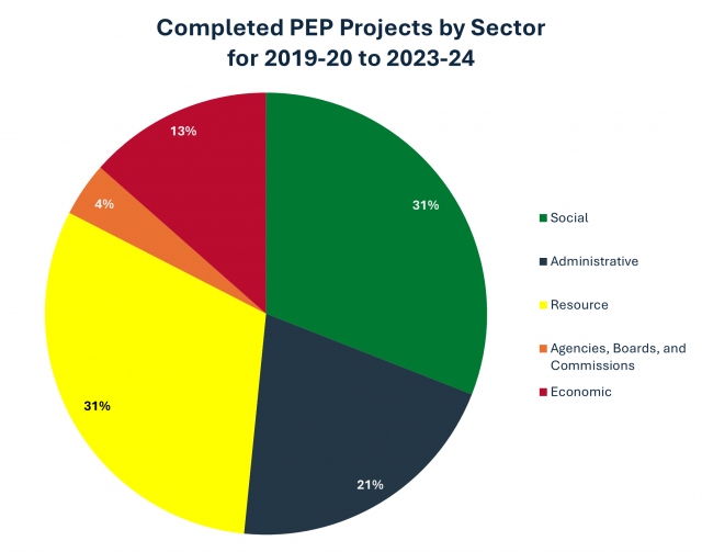Our clients include government entities, agencies, boards and commissions, and other stakeholders in the province. From the fiscal years of 2019-20 to 2023-24, the division completed a total of 126 projects. The subject matter of these projects can be classified into sectors which reflect the work of Government. The regulations that exist to deliver services to people and businesses are also classified into similar sectors. The public engagement and consultation projects of Government have an impact on the programs, policies, and legislation related to the mandates of core government departments, agencies, boards, and commissions.